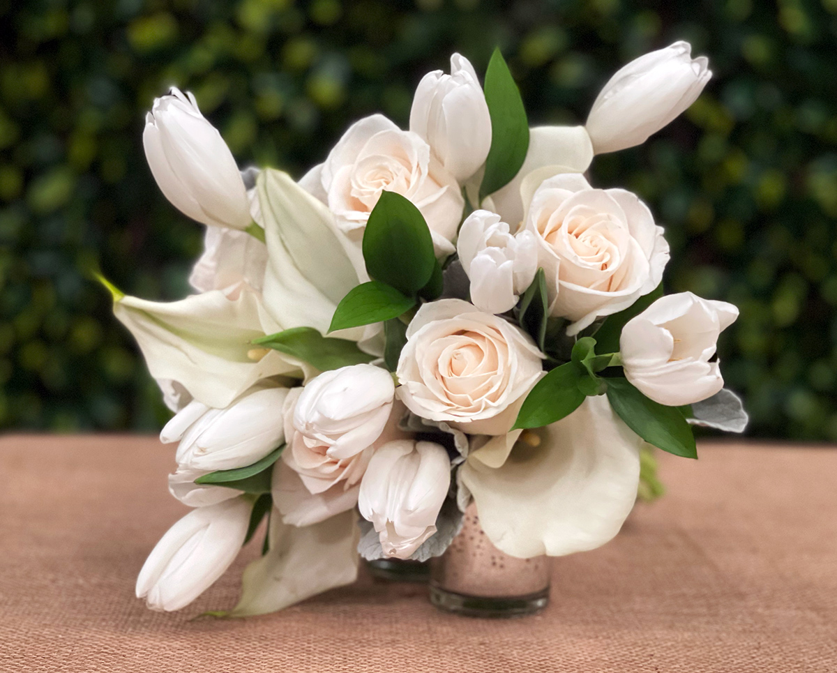 • Hand wrapped, fresh florals: (Vendela Roses, Hoary Stock & Hydrangeas. Comes with a matching Bouttoniére. “Isabella” is the default bouquet option but you can choose the “Alexandra” Calla Lily bouquet instead by request. >