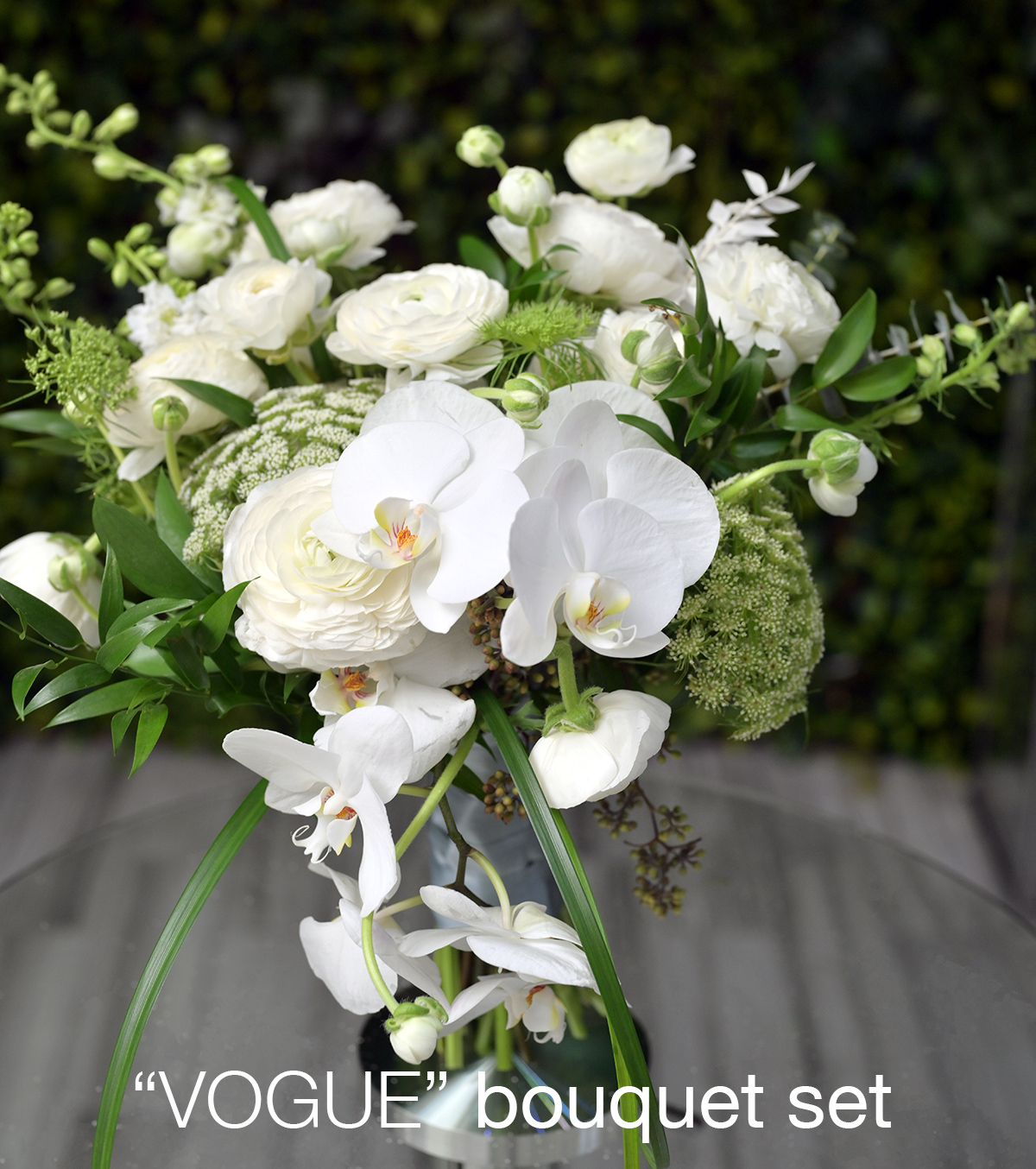 • Hand wrapped, fresh florals: (Vendela Roses, Hydrangeas & Stock Flowers. Comes with a matching Bouttoniére. Or to swap for an “Alexandra” at no extra charge. You can also choose to upgrade to “Vogue”, “Gigi” or others for a nominal fee. >